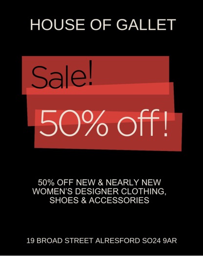 Together we can make a difference by making a decision to buy pre-owned & preloved designer wear that won’t cost the EARTH. The event is complimentary but a guest list will be in place to avoid over crowding so please RSVP Joanne on 01962 735362 or email joanne@houseofgallet.co.uk to secure your place.
