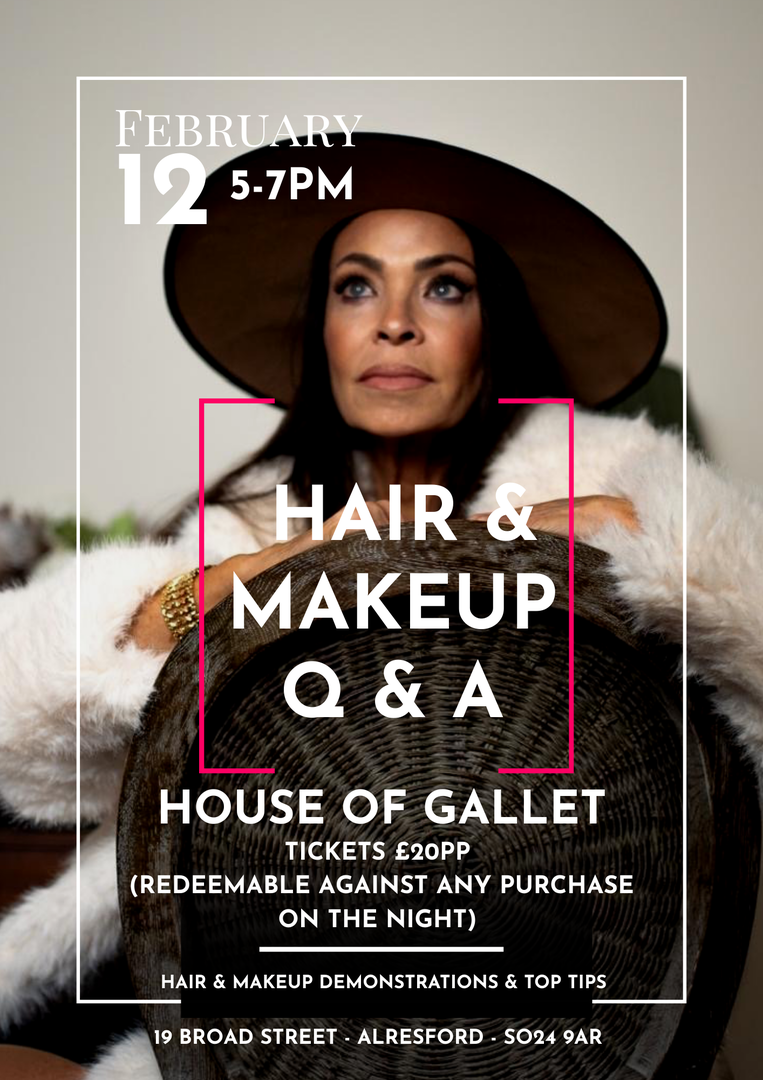 Enjoy an informal Q & A evening at our store as Carol shares with you her hair & makeup top tips - perfect for looking your best whatever the occasion Tickets cost £20pp which is redeemable against anything you purchase in store on the night, email joanne@houseofgallet.co.uk or pop in to purchase your ticket! Something wonderful for the diary! 5pm Arrive for some shopping time, 5:30pm Hair & Makeup Q & A time with Carol with a few small demonstrations. The event finishes at 7pm - A perfect ladies night out! These type of events sell out quickly so reserve your space as there are limited numbers. Looking forward to seeing you there!